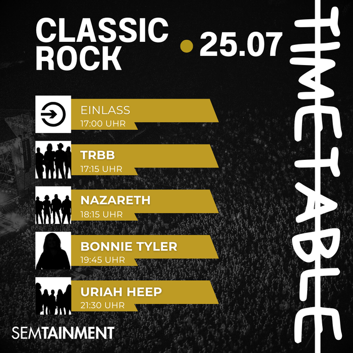 Hits wie Lady in Black, Easy Livin’, Total Eclipse of the Heart, It’s a Heartache, Love Hurts und viele weitere Rockklassiker werden an diesem Abend live zu hören sein! Uriah Heep, Bonnie Tyler und Nazareth garantieren ein unvergessliches Erlebnis. Das Programm dauert über fünf Stunden – mehr Classic Rock an einem Abend geht nicht!