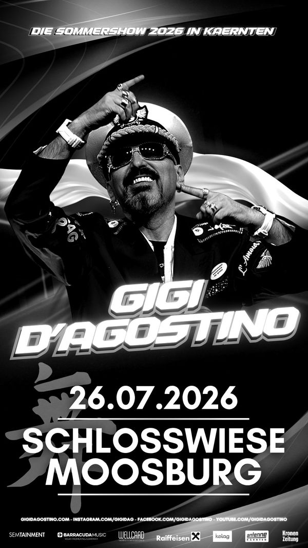 Mit seinen unvergesslichen Hits wie "L'Amour Toujours", "Bla Bla Bla", "The Riddle", "In My Mind" und vielen weiteren Klassikern wird Gigi D'Agostino die Fans quer durch Österreich zum Feiern bringen.